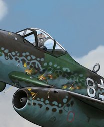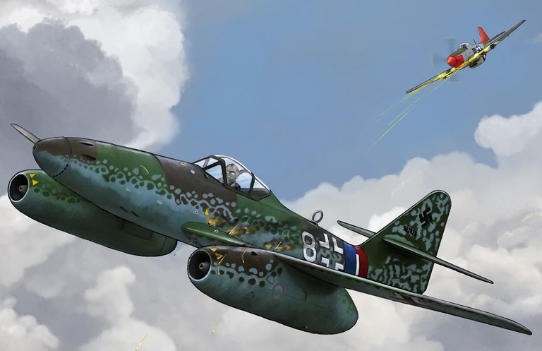 The ME262 was the world's first operational jet-powered fighter aircraft. Here, one of the Tuskegee Airmen, the famed Red Tails, takes one on in his P-51 Mustang.